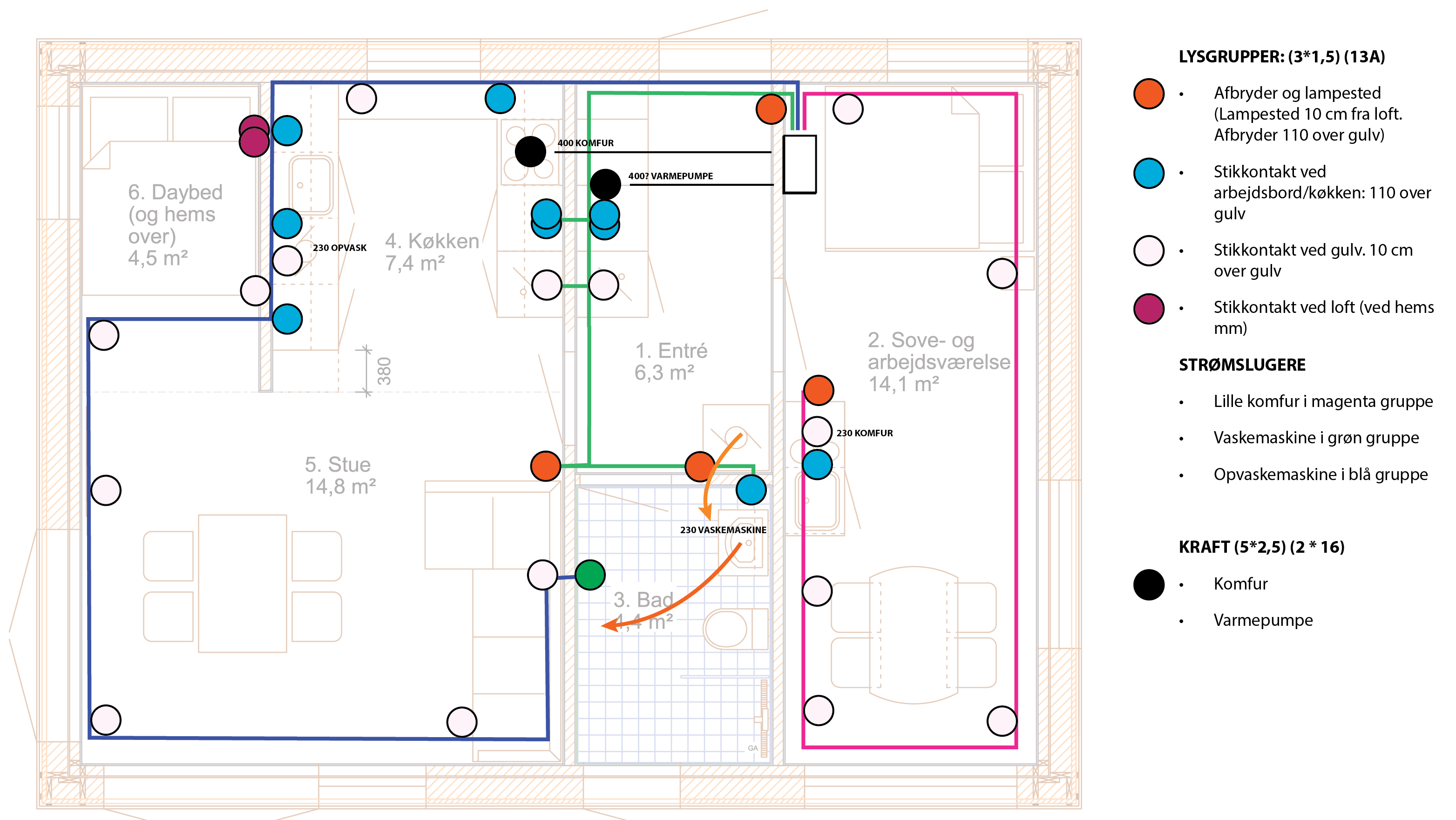 De gule cirkler markerer alle de steder, hvor jeg har afløb. Vand og el skal ind i bryggers til højre for dør, set udefra.
